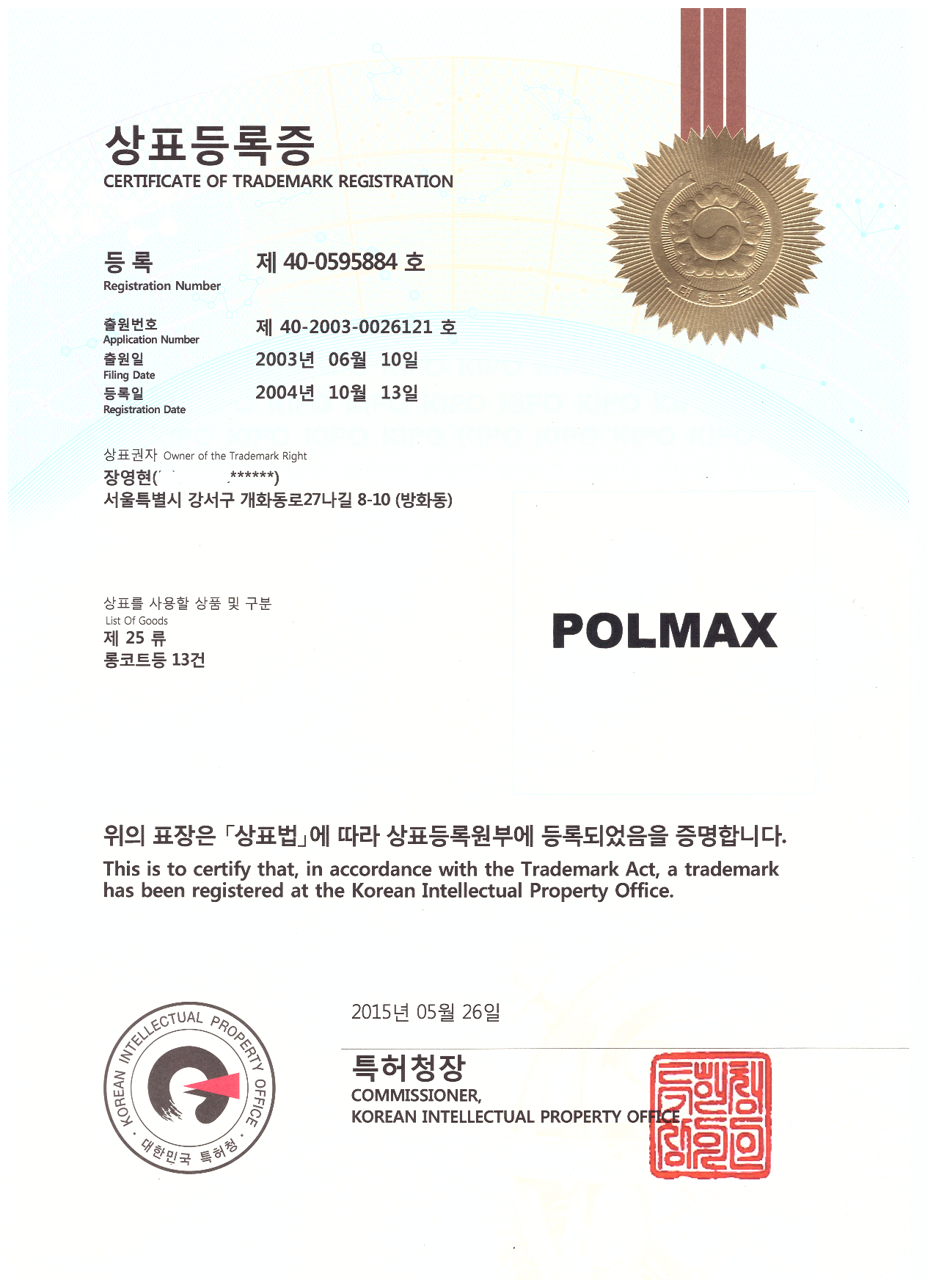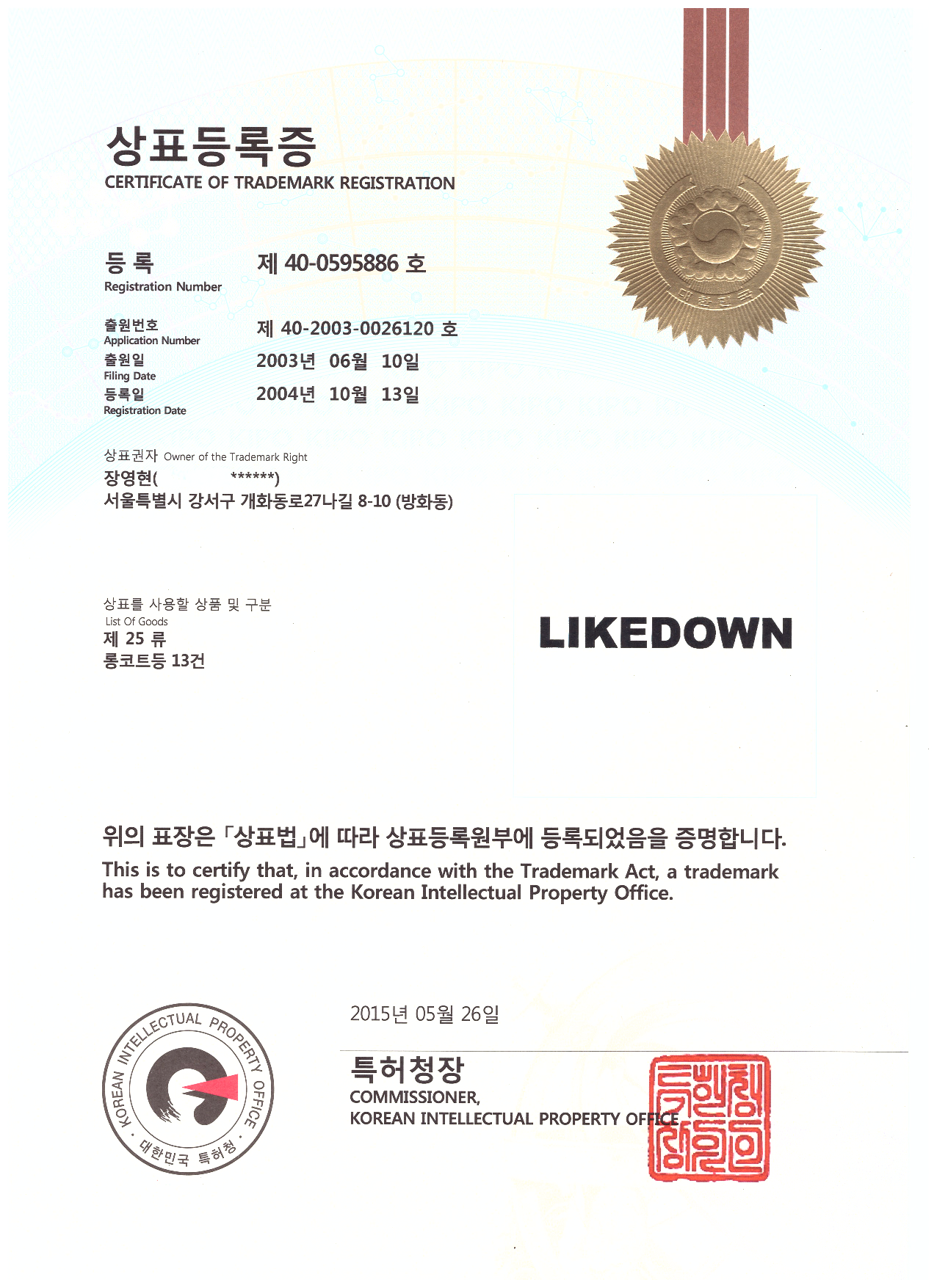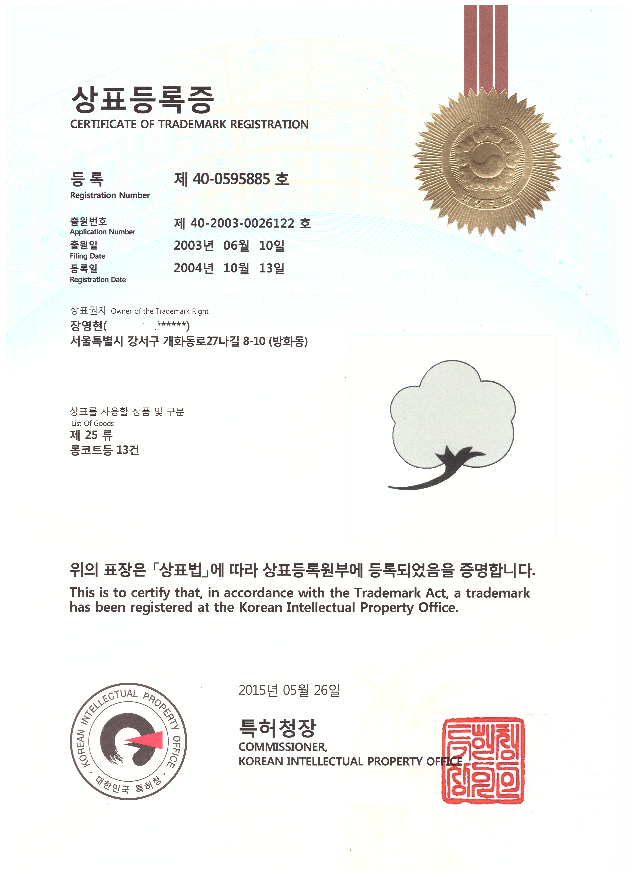 This is certify that, in accordance with the Trademark Act, a trademark has been registered at the Korean Intellectual Property Office.