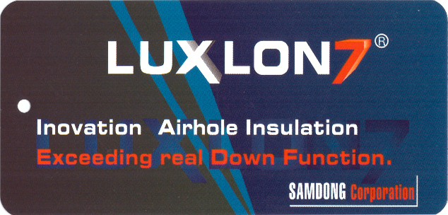 'LUXLON7' 은 선진국에서 가공하기 어려운 특수 가공기법의 최첨단공법으로 생산된 첨단 과학원료로 하이테크 제품으로 일본, 독일, 미국, 중국 등 의류방한용 다운 대체 소재로서 널리 보급사용 선진국 패션산업 신소재로 각광받고 있는 최첨단 소재입니다.